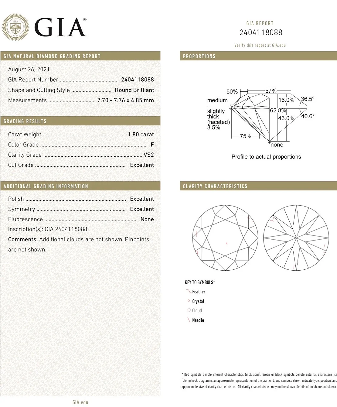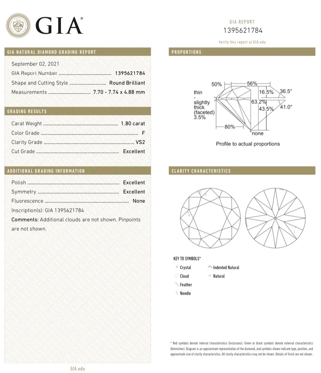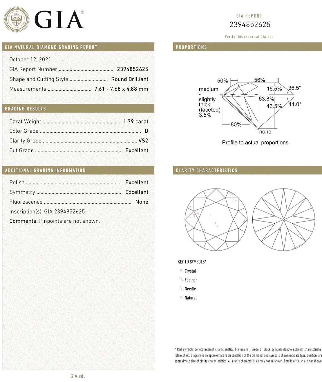 สำหรับเม็ดนี้น้ำหนักไม่ถึง 1.8 กะรัตแต่ที่ได้เพิ่มมคือ D Color หรือ น้ำ 100 ระดับสูงสุดของ GIA หากลูกค้าไม่ได้ต้องการเพชรที่น้ำหนักต้องตามเกณฑ์ขึ้นไปเพราะ ระหว่าง 1.79 กะรัต กับ 1.80 กะรัตมีความต่างของราคามากพอสมควร ถือว่าเม็ดนี้เป็นตัวเลือกที่น่าสนใจ แต่อย่างไรก็ตาม ในส่วนของ Clarity นั้น มีตำหนิกระจายตัวอยู่ตามหน้าเพชร เป็นกลุ่มขนาดเล็ก