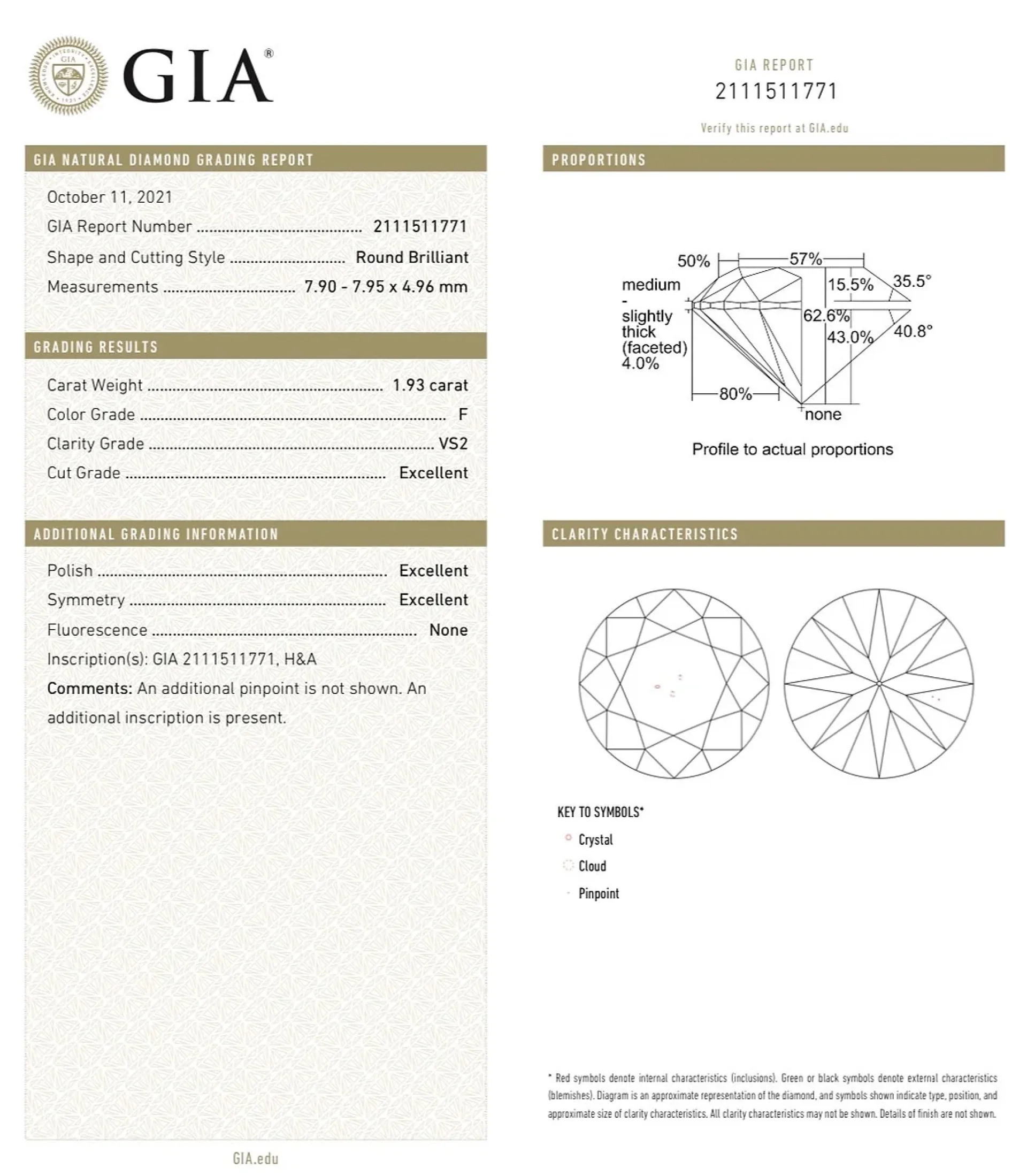 (1) 1.93 Carat, F Color, VS2, 3EX